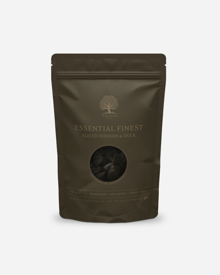 Oplev en verdensklasse gourmetoplevelse for din firbenede ven med Essential Finest Sliced Venison & Duck hundegodbidder - en himmelsk kombination af vildt og and i skiver.