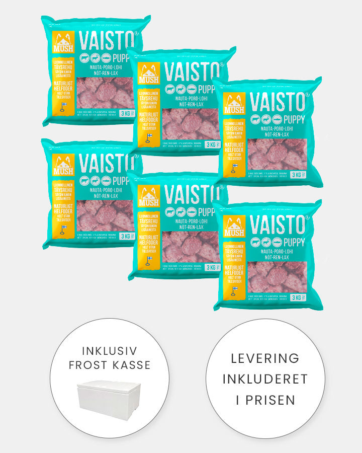 MUSH Vaisto® Puppy isblå (okse-ren-laks) er et fuldfoder til hvalpe.