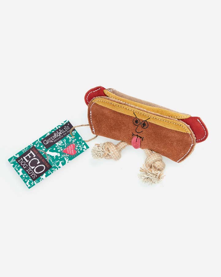 Harry the Hotdog, har et ydre der er lavet af ruskind med naturligt jutefiber-fyld og jute-reb-ben!