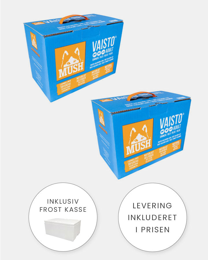 MUSH Vaisto® blå (okse-kalkun-laks) blå er et fuldfoder til voksne hunde. MUSH Vaisto® blå er bygget til alle voksne hunde, men er specielt egnet til hunde med hud- og/eller pelsproblemer.