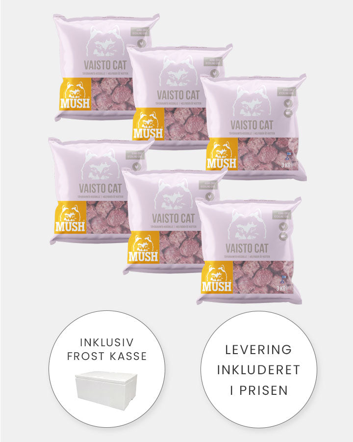 MUSH Vaisto CAT Pink (kylling-gris) er et fuldfoder til voksne katte. Det indeholder flere omega-3 fedtsyrer, E-vitamin og B-vitamin, og er derfor ekstra godt for katte med hud- eller pelsproblemer, eksempelvis i fældningsperioder hvor pelsen kan blive mat.