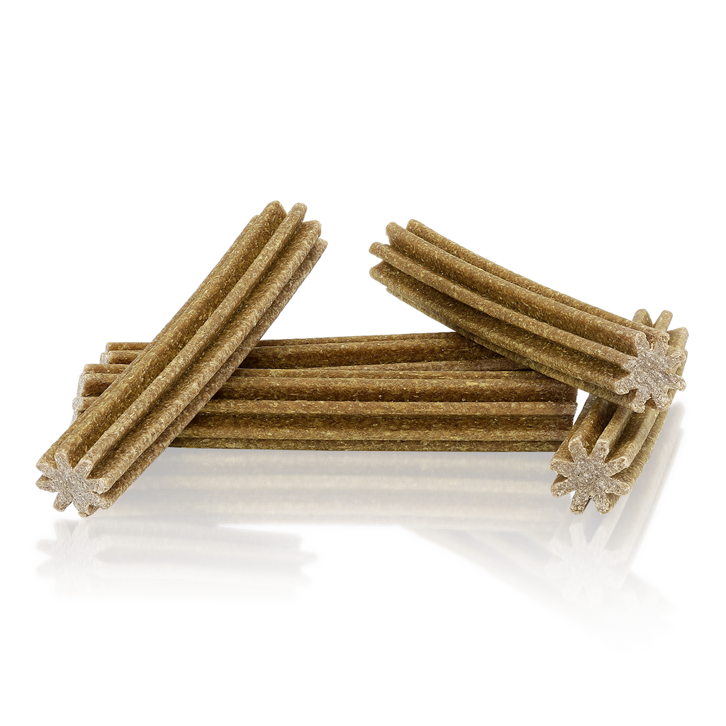 Denne stjerneformede, semi-bløde tyggepind er ikke bare uimodståelig – den bidrager også aktivt til din hunds mundhygiejne. Den indeholder SHMP, som hjælper med at forebygge tandsten, forfriskende mynte mod dårlig ånde, samt kollagen og gurkemeje, der støtter både led og immunforsvar. En funktionel snack med ekstra sundhedsbonus!